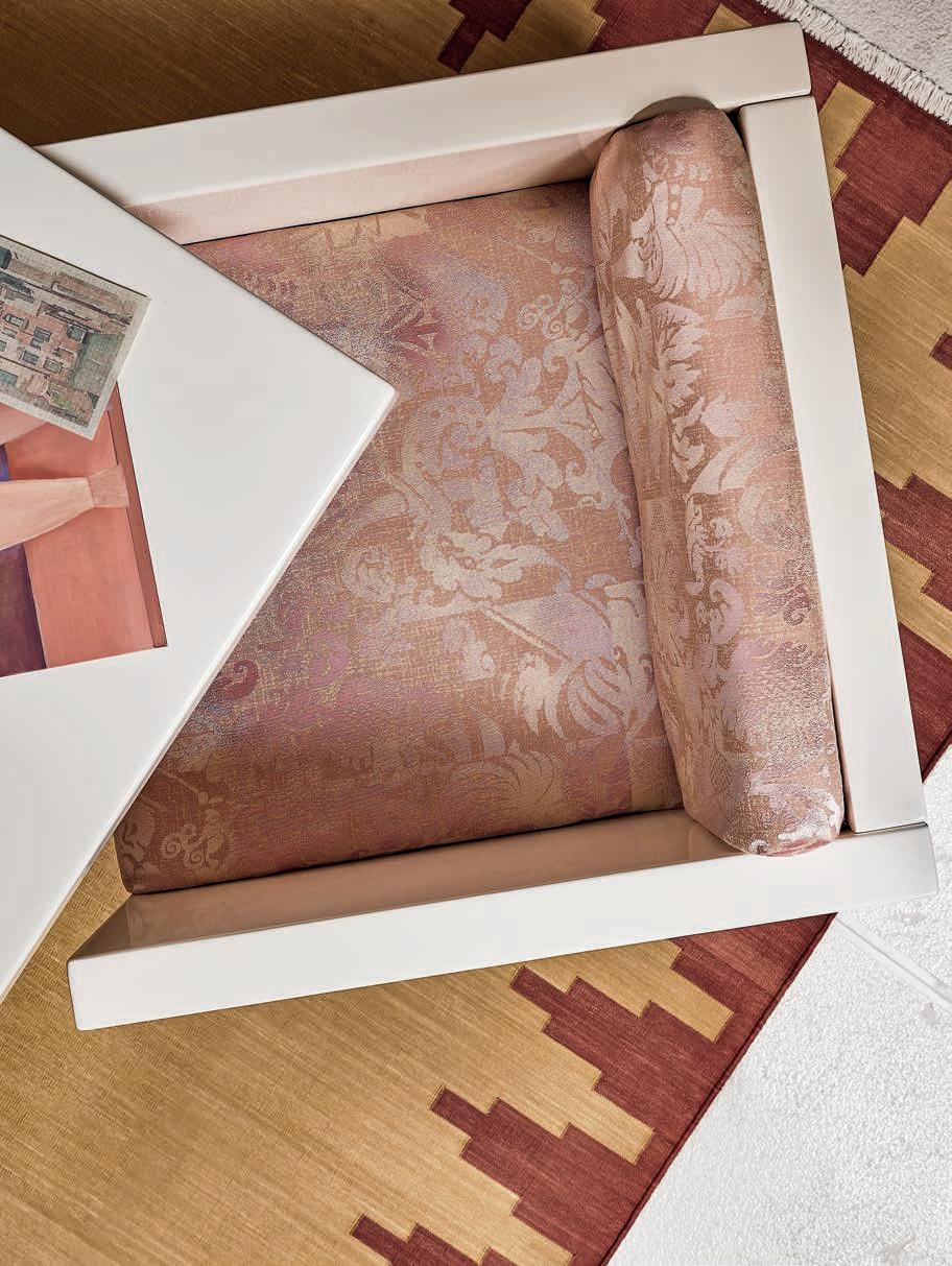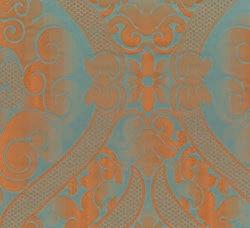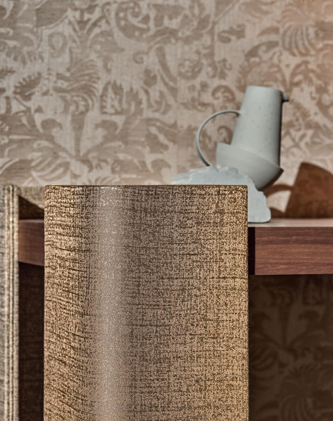 A light lampas in relief, on a precious silk ground that comes from the working of a fragment of damask stored in the historical archives. The surface recreates the effect of the cuoridoro, typically Venetian leather decorative coverings.