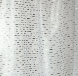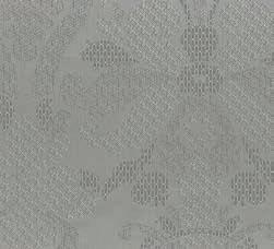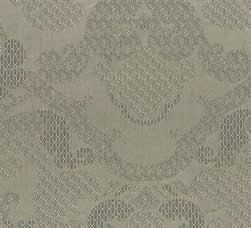 Tenda operata. Una sorta di partitura misteriosa fatta di segni in libertà, come le note prodotte da un sax. I segni, opachi, sono in rilievo sul fondo di raso particolarmente evidenti sul fondo grigio. Una tenda dall’aspetto serico e con una mano molto piacevole.