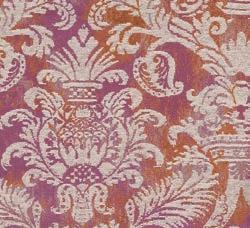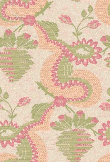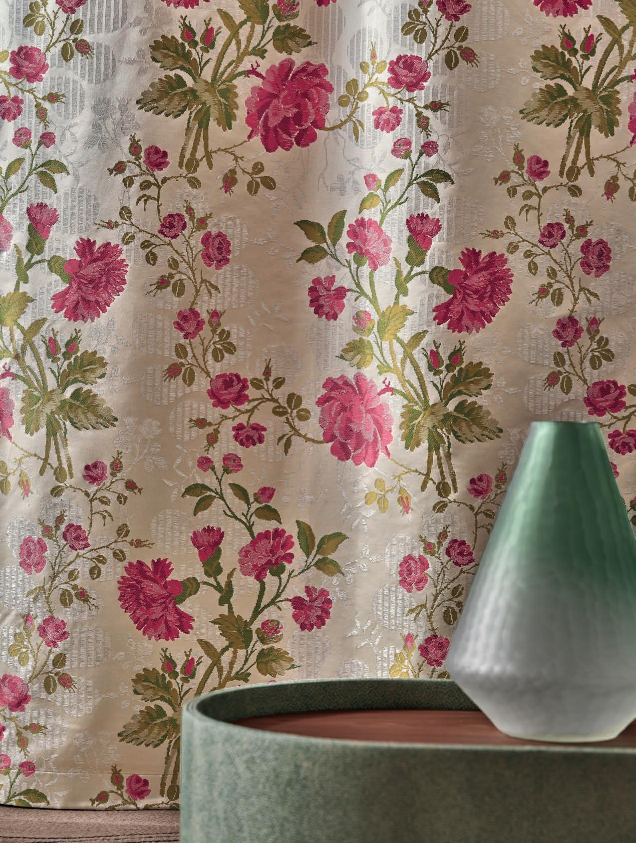 Silk jacquard, created from a small fragment in the archive textile collection. What makes it unique is an unprecedented reworking which brings us a magnified version of the original small floral motif that stands out on the elegant and elaborate satin ground. Available in only one version, in which the almost irreverent tones of shocking pink are softened by a subdued ivory.