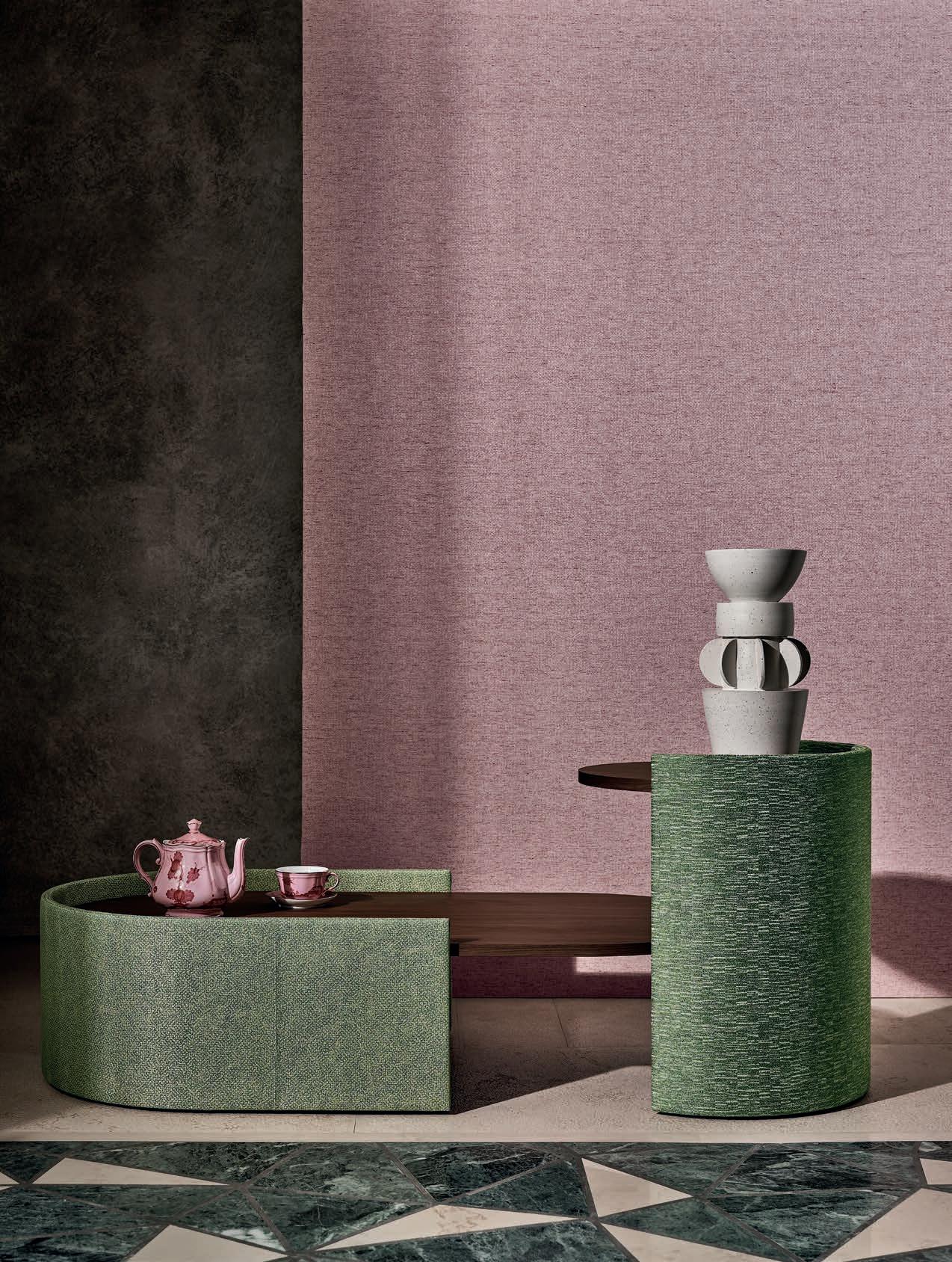 Un elegante falso-unito cangiante che richiama la superficie del vetro molato. Glass Weave cattura la luce e gli effetti tipici del vetro lavorato. Un tessuto “vetroso” che ricorda la trasparenza quasi incorporea del vetro di Murano, in particolare delle creazioni in vetro dell’architetto e designer veneziano Carlo Scarpa. Delicati e ricercati i colori.