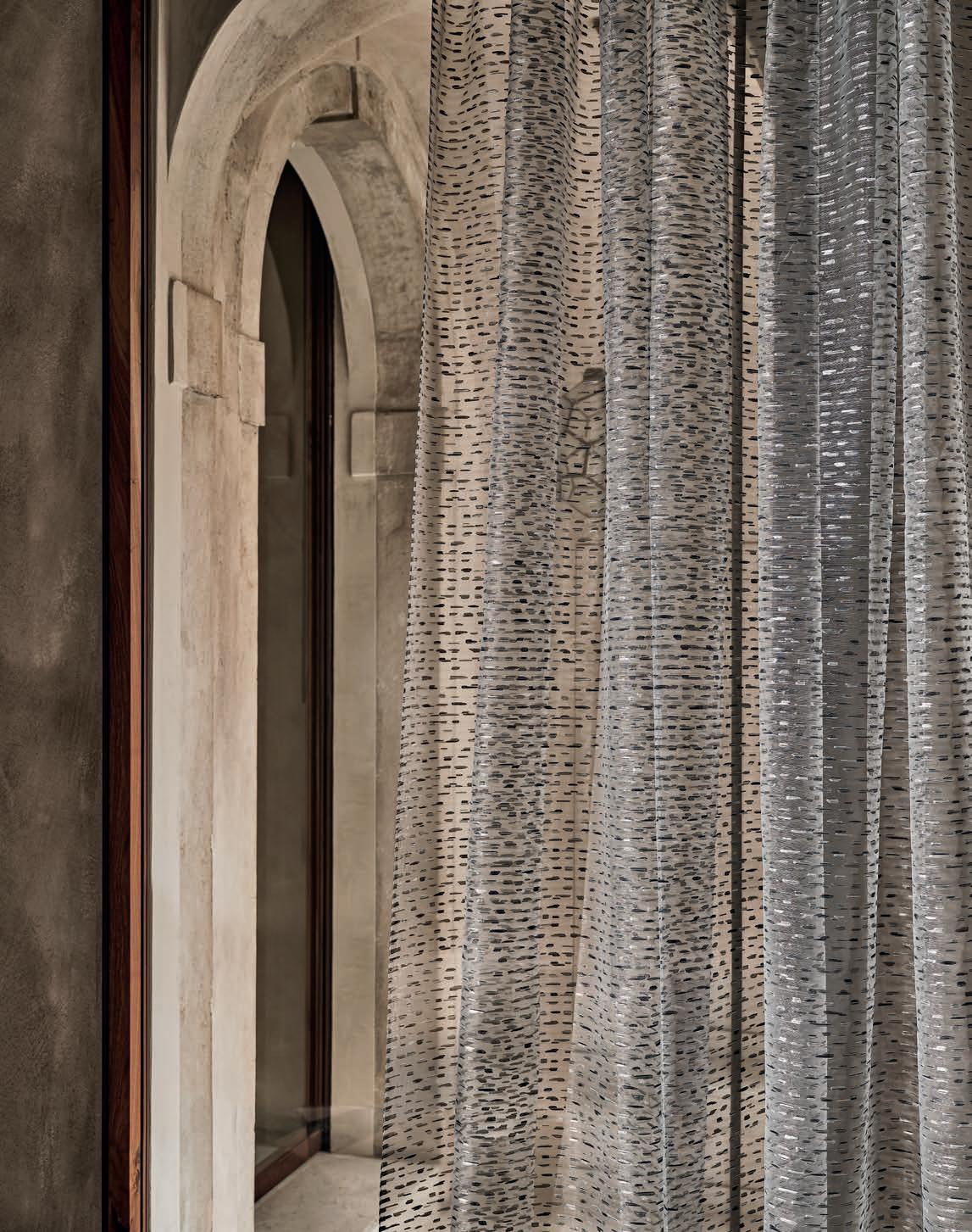 Tenda operata in doppia altezza. Richiama l’effetto filigrana delle murrine delle creazioni in vetro di Carlo Scarpa. Una superficie craquelé, solcata da un sottile reticolo di linee irregolari. In 4 varianti, tutte caratterizzate da un prezioso effetto metallico.