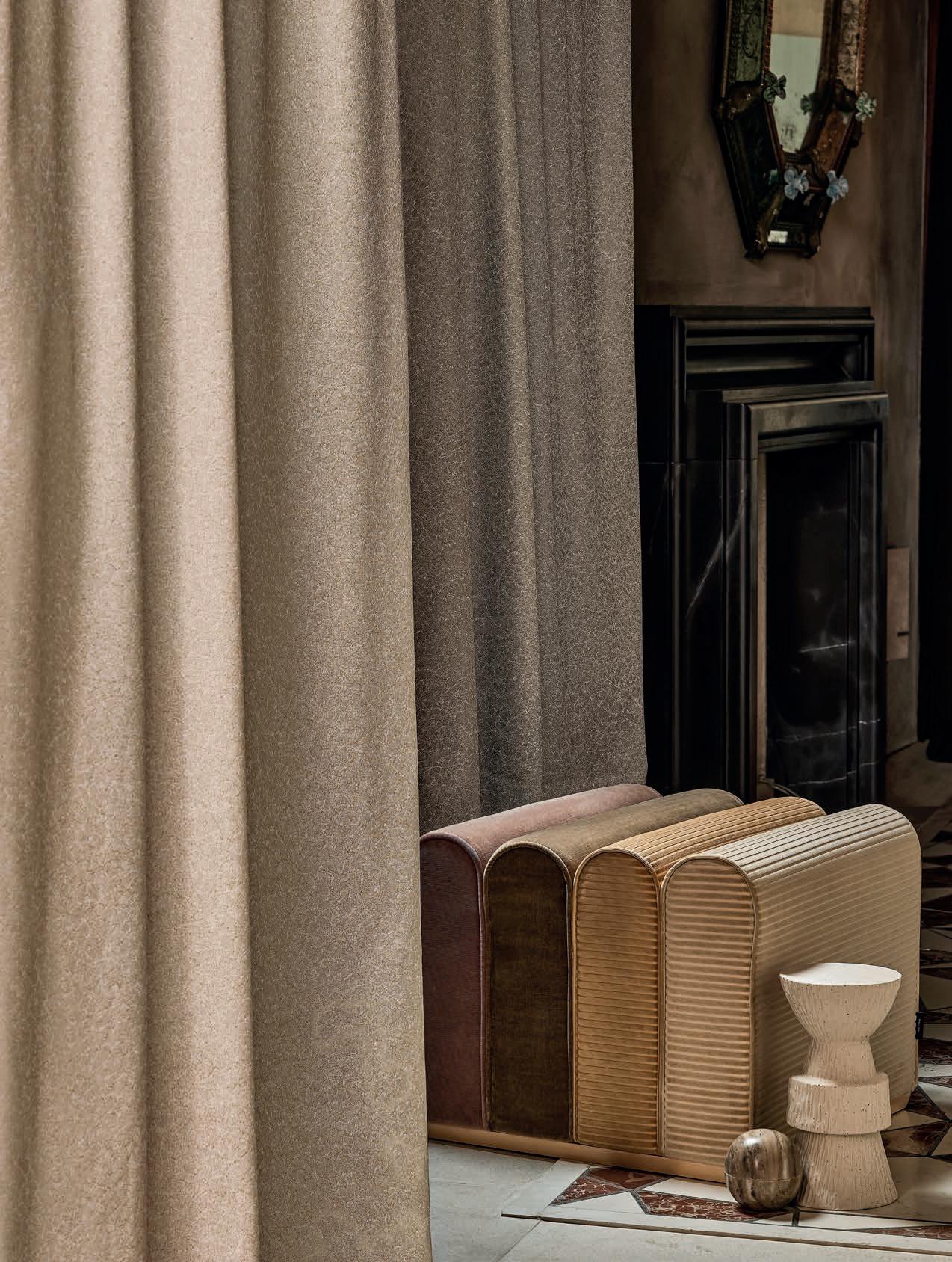 Tenda da drappeggio coprente e dalla morbida caduta. Presenta un micro-disegno di superficie, realizzato con filati opachi e filati lucidi che reagiscono diversamente al processo di tintura. Twilight è disponibile in 9 colori, tutti nei toni pastello.