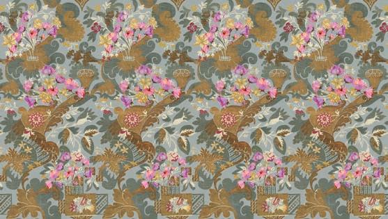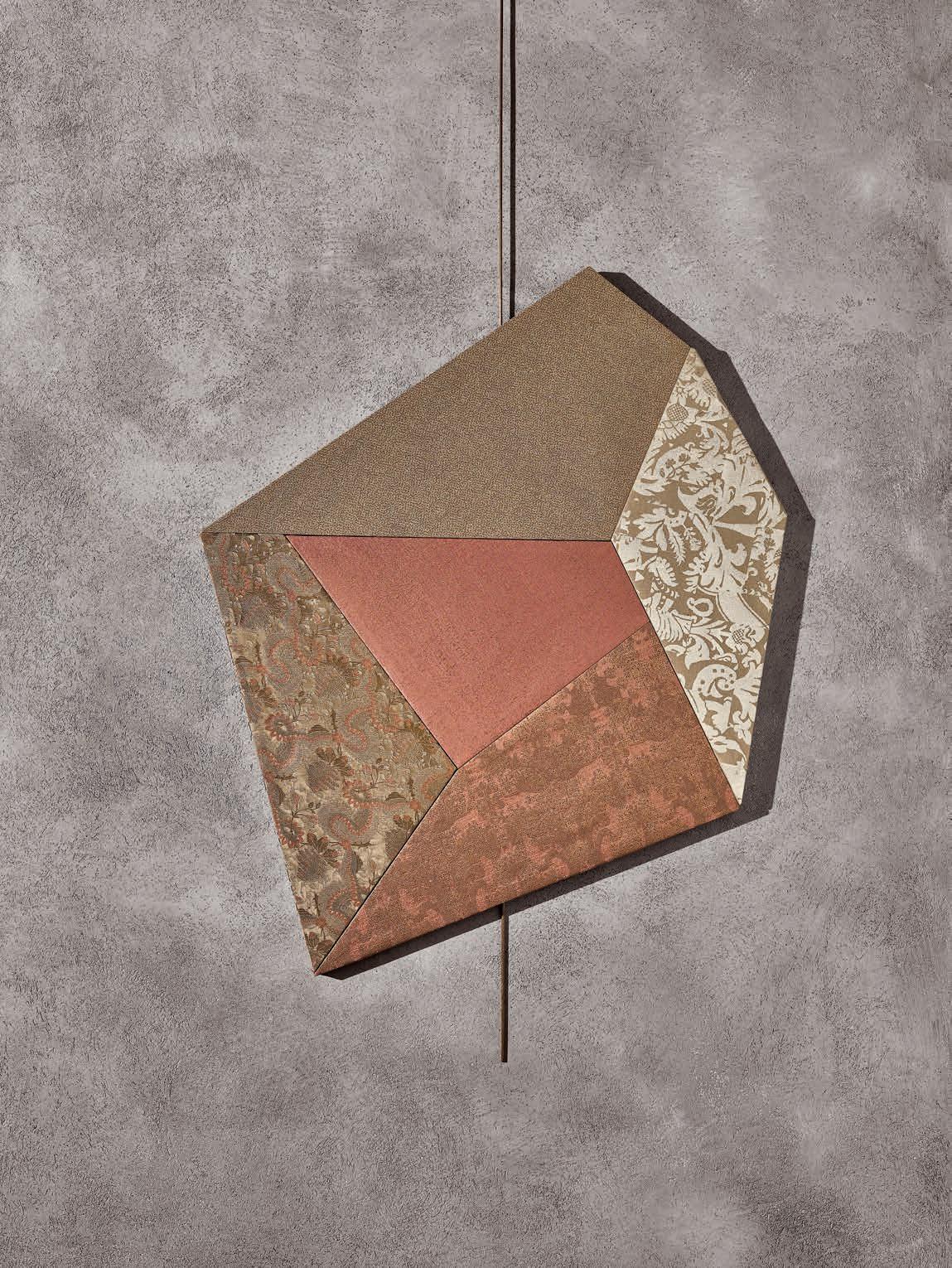 Una composizione di “tessere” di damasco di diverse epoche (Seicento e Settecento) appartenenti all’archivio storico. Dall’unione di piccoli frammenti nasce un nuovo pattern serico, elegante, colorato come un vetro soffiato.
