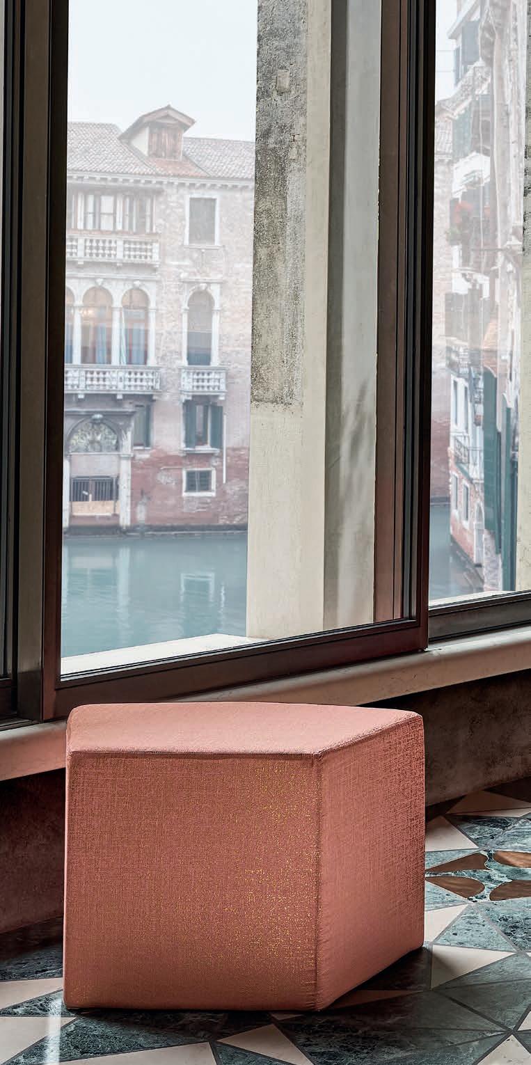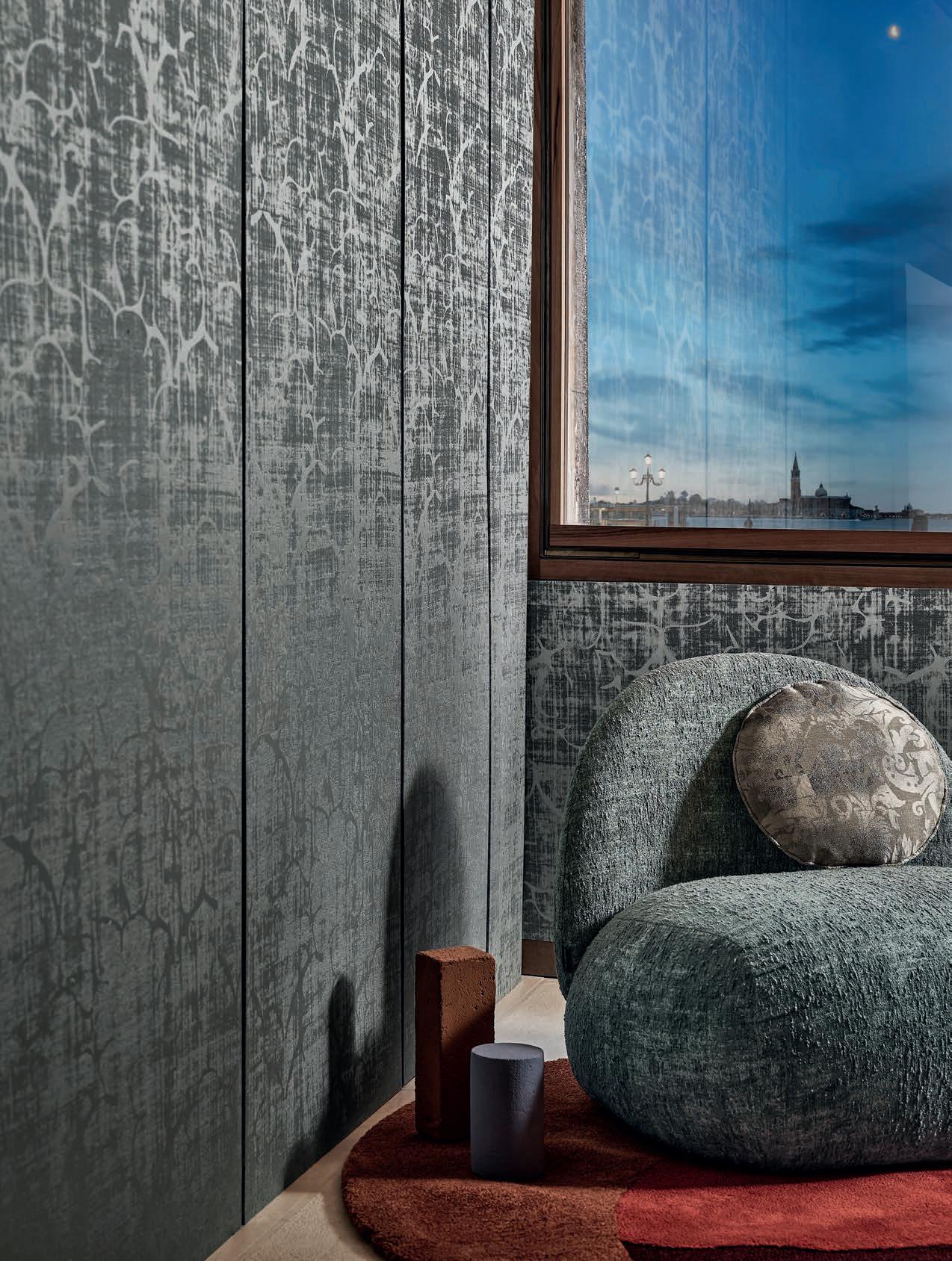 Jacquard contemporaneo, il cui disegno di superficie richiama i materiali che Carlo Scarpa utilizzava nelle sue opere architettoniche. Alcune varianti evocano i riflessi della luce del giorno e della luna sull’acqua della laguna.