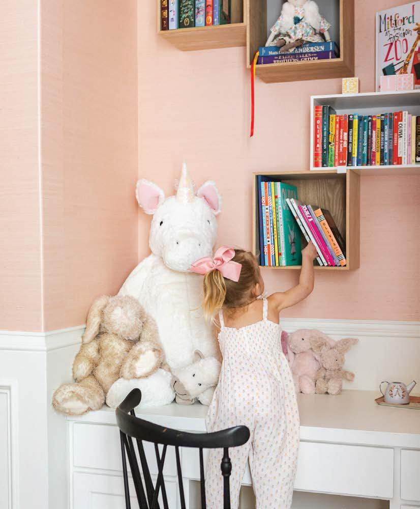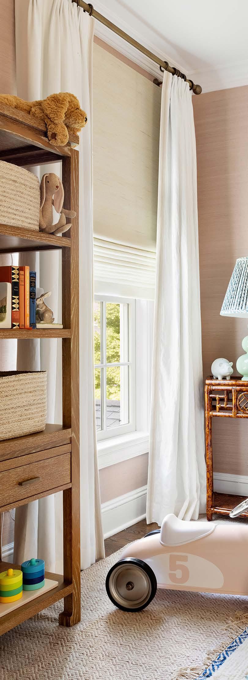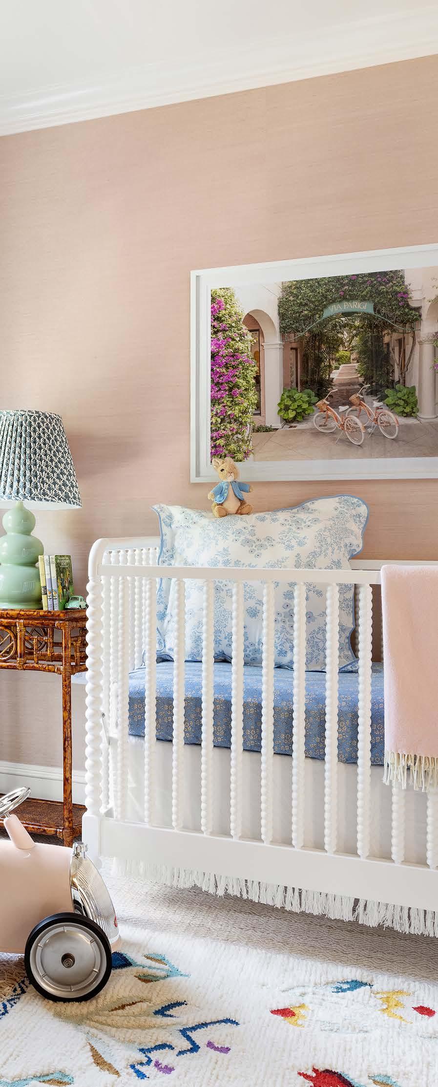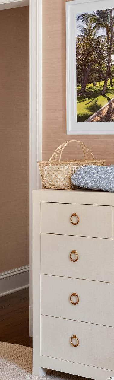 TERS’ SPACES “I really wanted my girls’ rooms to be spaces they can grow into over time. I never like to design nurseries that need to be updated or changed just a few years after install and I really like children’s spaces to feel just as sophisticated, considered, and functional as all the other spaces in a home. In my older daughter’s room, I used a wallpaper from my collection with The Mural Source, which has birds and chinoiserie elements to it; it’s really sentimental to me to have something I made in there and it’s become special to both of us. She is going to be five in August and she always says, ‘Mommy made the wallpaper!’ For my younger daughter’s room, I used a solid rose-hued grasscloth for texture and it’s really serene. In her