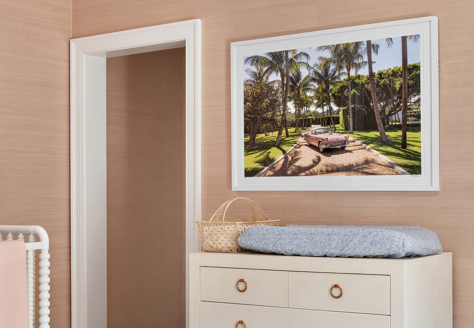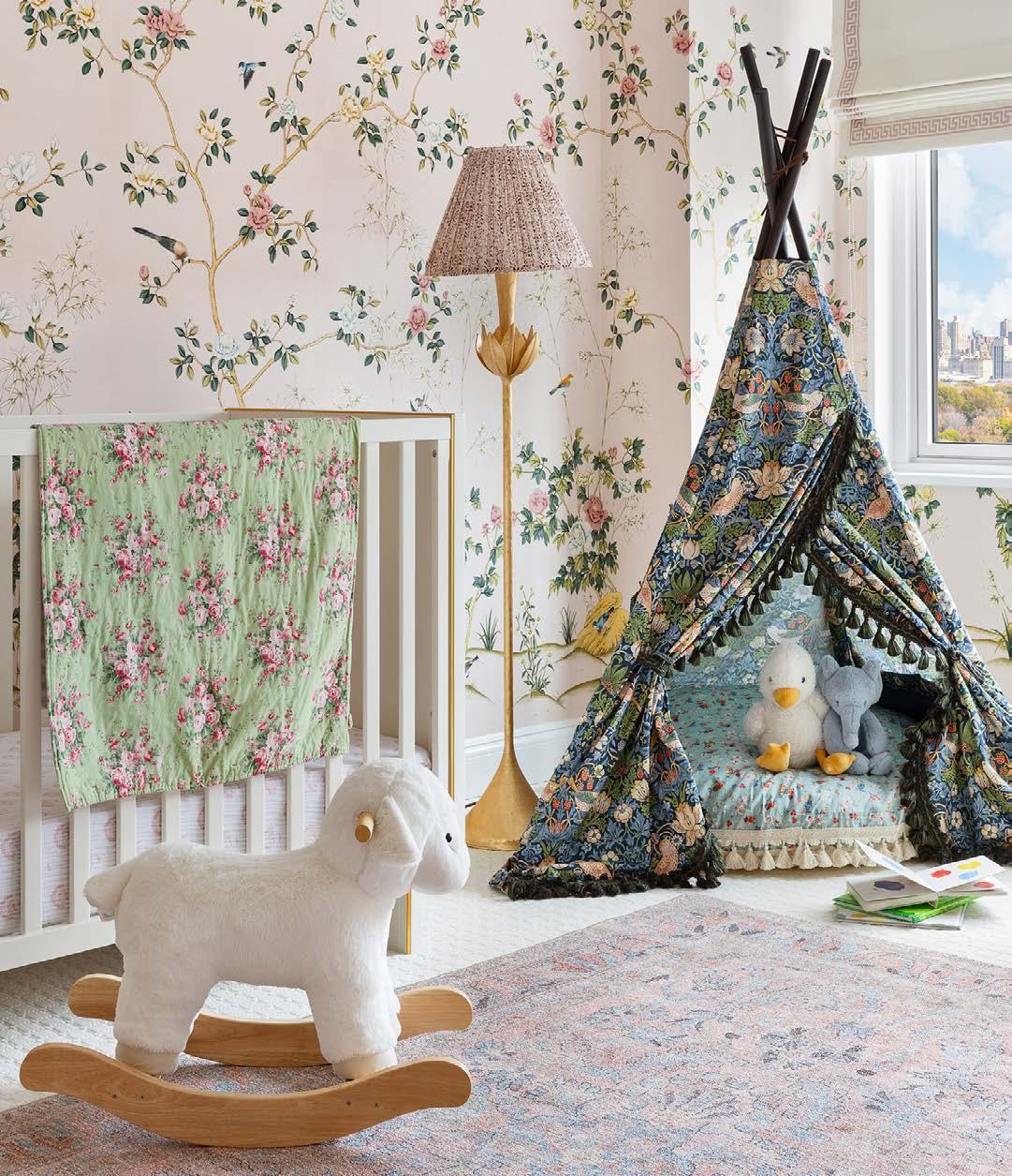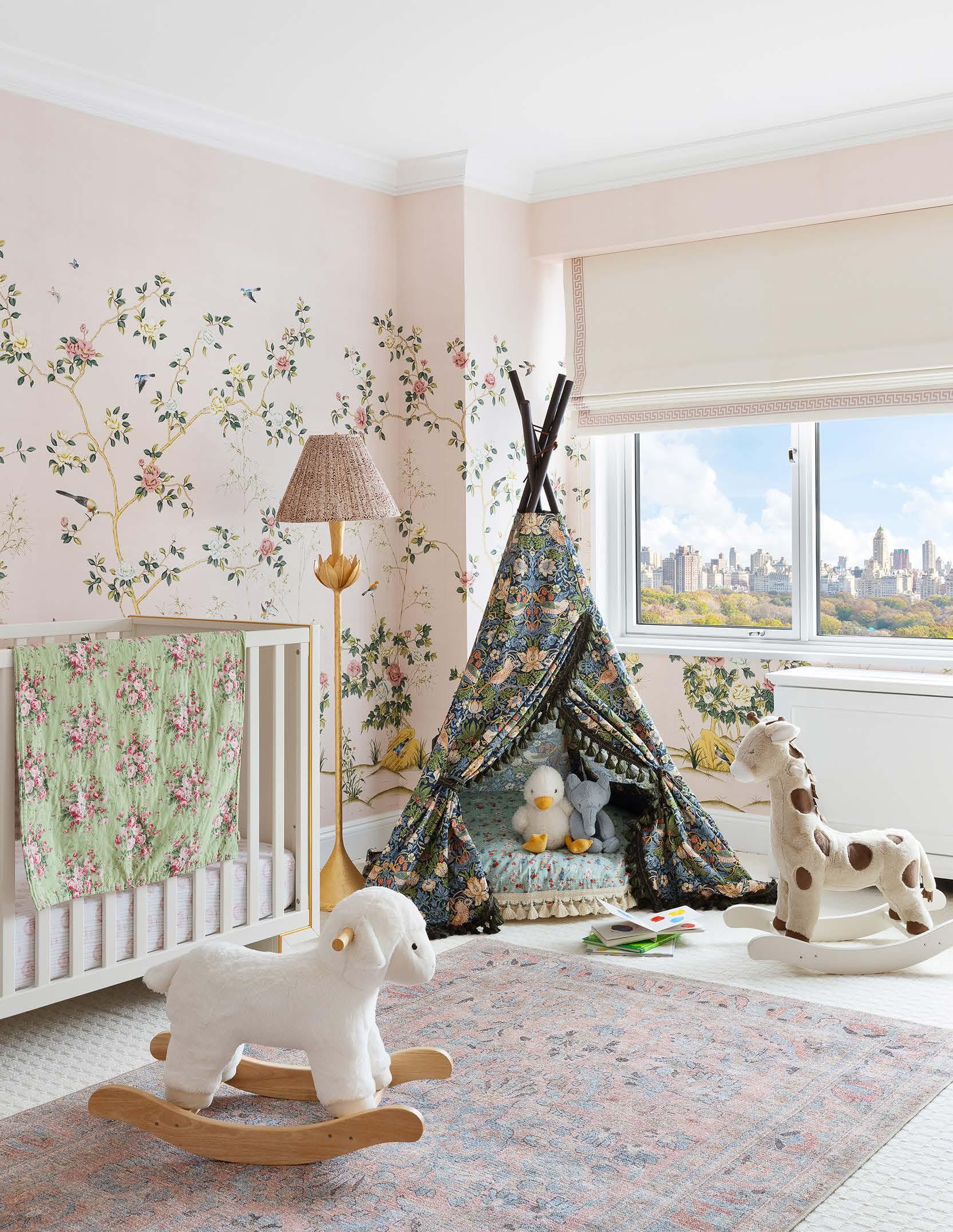 TERS’ SPACES “I really wanted my girls’ rooms to be spaces they can grow into over time. I never like to design nurseries that need to be updated or changed just a few years after install and I really like children’s spaces to feel just as sophisticated, considered, and functional as all the other spaces in a home. In my older daughter’s room, I used a wallpaper from my collection with The Mural Source, which has birds and chinoiserie elements to it; it’s really sentimental to me to have something I made in there and it’s become special to both of us. She is going to be five in August and she always says, ‘Mommy made the wallpaper!’ For my younger daughter’s room, I used a solid rose-hued grasscloth for texture and it’s really serene. In her