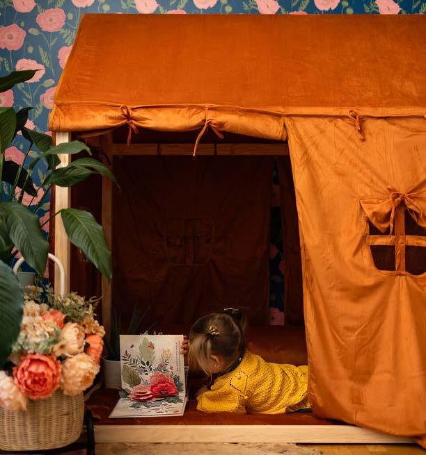 ON KEEPING SPACES PRACTICAL FOR HER FAMILY “I try to always utilize fabrics that can take a beating, whether they are performance formulas or just easily wipeable. I also like to use patterned textiles, because it’s easier to disguise a big stain when there’s a lot of movement, rather than something solid. I also love slipcovers, because you can zip it off and throw it into the wash! I use large woven wicker baskets from Serena & Lily and Pottery Barn with lids to hide toys and books and keep clutter contained. I really try to think about the intention of the space and how I want to use it before I create my floor plans, which allows for little ‘active moments,’ like creating a book nook tent in my older daughter’s room for nighttime reading (twinkle lights are a must!).”