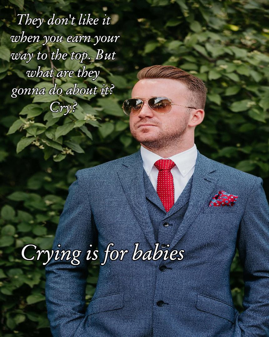 But, after four weeks on the wage worker grindset, I glimpsed again through the portal and found that Adam wasn’t waiting for me. Undeterred, I moved onto the next part of my plan — putting motivational quotes into photos of men in tuxedos and posting those on Instagram.