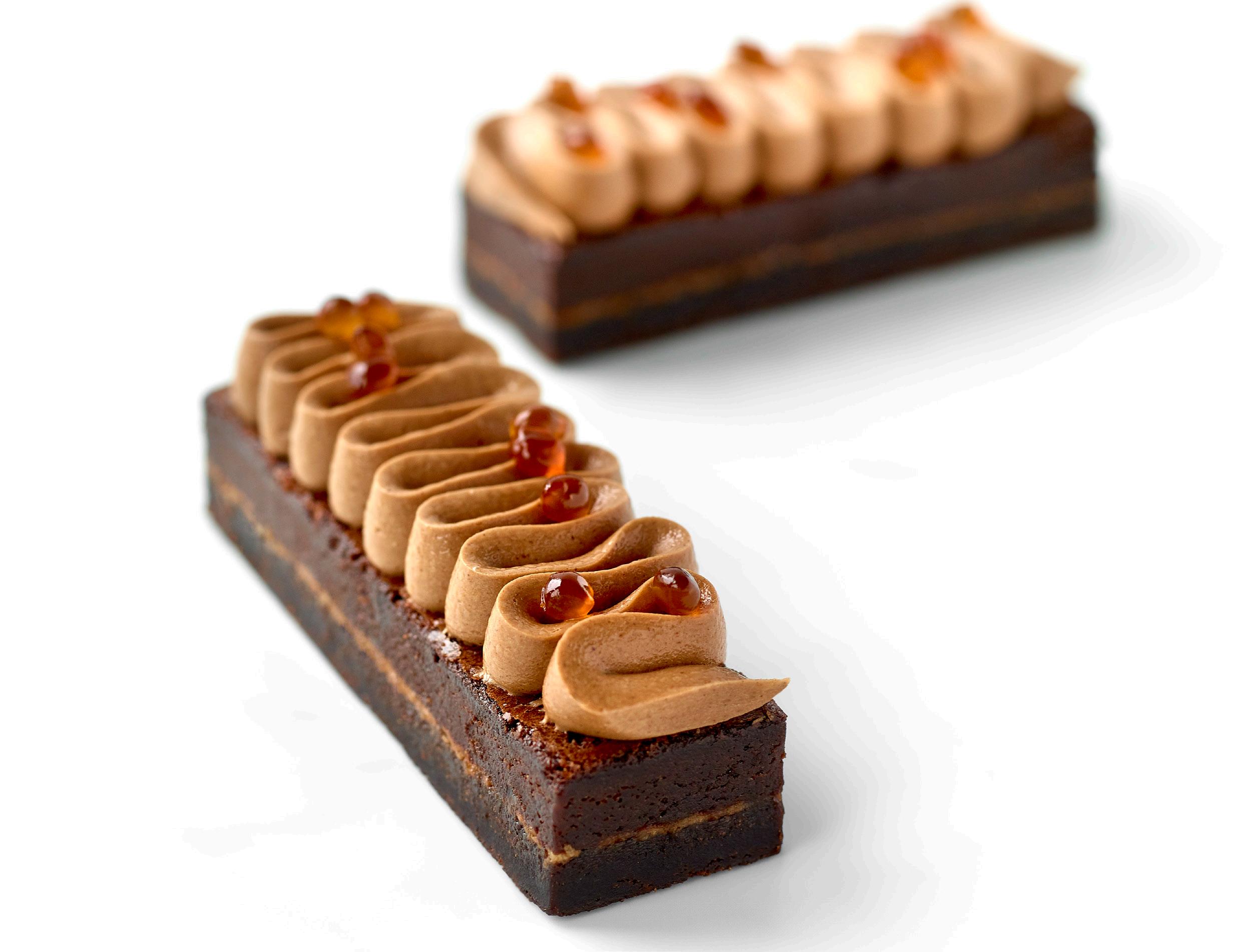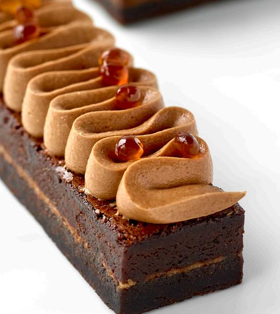 Ganachen lægges mellem to brownie bunde. Skær kagerne i ønsket størrelse og sprøjt ganachen på toppen i ønsket mønster og pynt med Smoobees Caramel.