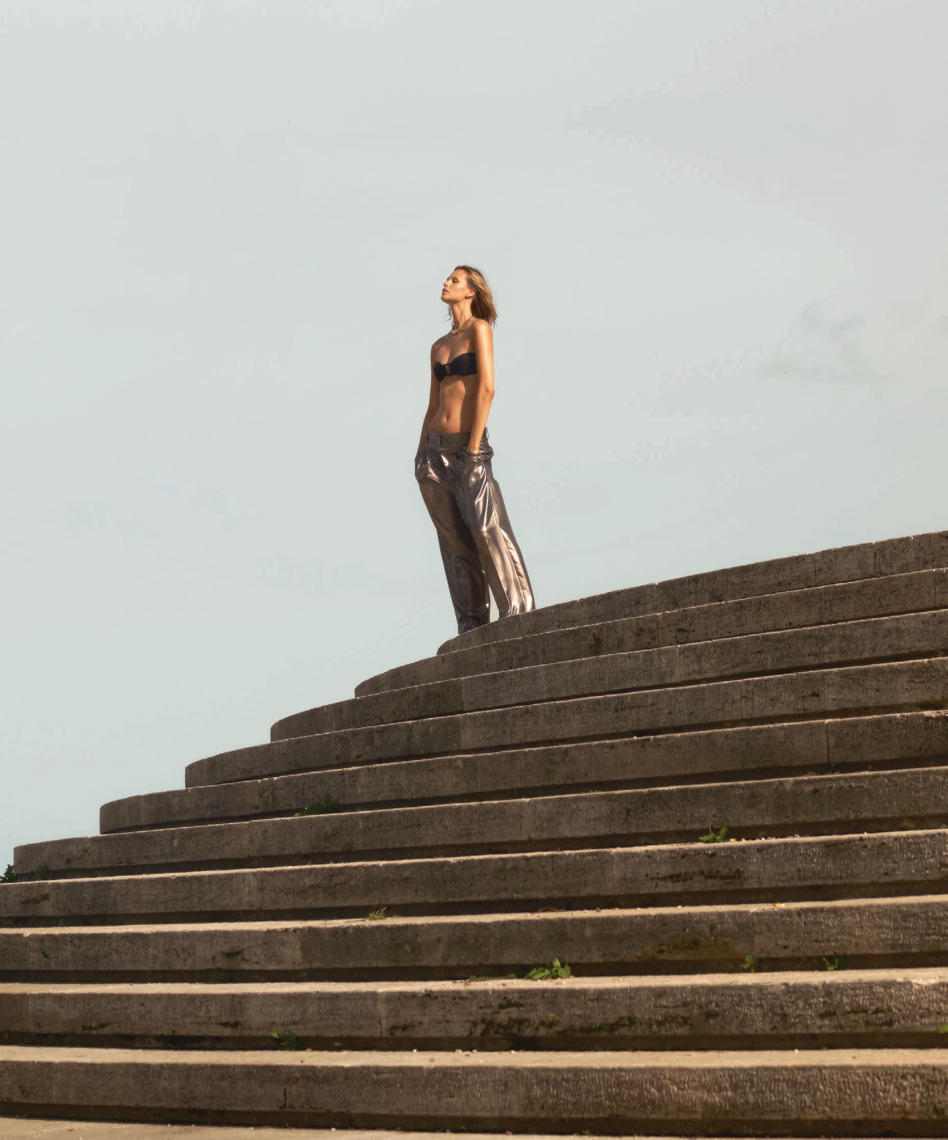 KARLA COLLETTO swimsuit, available at Neiman Marcus, 305.865.6161; BRUNELLO CUCINELLI trousers, 305.864.4833; ISABEL MARANT necklace and bracelet, 305.763.8189