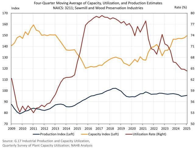 In the first quarter of 2025, sawmill and wood preservation firms continued to report lower capacity utilization coupled with stagnant production. The utilization rate, a ratio of actual production and potential production, was 64.4% in the first quarter on a four-quarter moving average basis. The utilization rate has continued to drop since 2017, as capacity (or the capability to produce) has increased, but production has remained lower than in 2018.