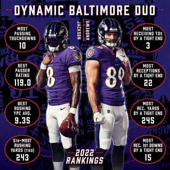 1984 20111987 1987 2014 PASS RUSH DOMINANCE JUSTIN HOUSTON 2014 MICHAEL STRAHAN 2001 22.5 22.0 22.0 21.0 21.0 T.J. WATT 2021 22.5 22.0 “Here, with the pressure we bring, it’s hard for the guard to help; it’s hard for thes running back to chip. They’ve got to match up with other guys, and if you leave me one-on-one, I’m going to win my battles.” - OLB Justin Houston on Baltimore’s defensive schemeOLB 4 x PRO BOWLER second-team all-pro1 x First-team all-pro1 x career sacks104 sacks in 2014 w/ KC22 CHARTS AMONG ACTIVE NFL DEFENDERS 4-SACK MINIMUM; 8-SACK STANDARD OLB Justin Houston has tallied at least 4 sacks in each of his 11 full seasons and at least 8 sacks seven times during his career AMONG ACTIVE NFL DEFENDERS MOST 8-SACK SEASONSMOST 4-SACK SEASONS Rk. Player(Team) Seasons 1. VonMiller(Buf.).............9 2. AaronDonald(LAR)..........8 3. JustinHouston(Bal.).....7 CameronJordan(NO).........7 CarlosDunlap(KC)...........7 ChandlerJones(LV)..........7 7. Pierre-Paul &ThreeMore....6 Rk. Player(Team) Seasons 1. CalaisCampbell(Bal.) ...12 CarlosDunlap(KC)..........12 3. JustinHouston(Bal.).....11 4. JerryHughes(Hou.).........10 CameronJordan(NO)........10 RobertQuinn(Chi.).........10 VonMiller(Buf.)............10 2022 BALTIMORE RAVENS 28 RELEASE NOTES