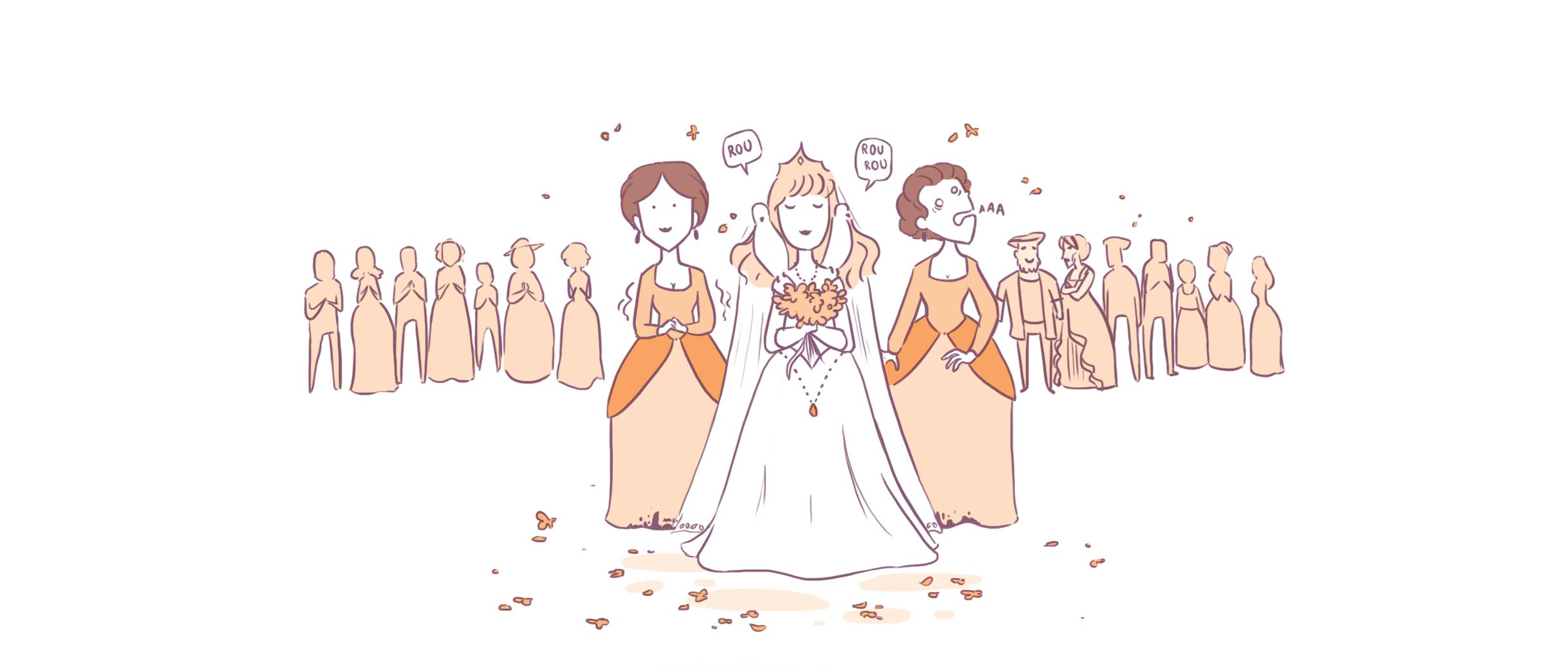 Il giorno del matrimonio, Cenerentola è accompagnata dalle sorellastre. Su ciascuna delle sue spalle si è posata una colomba.