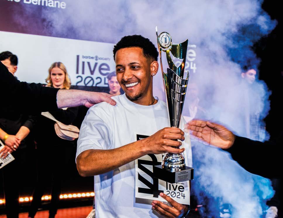 最佳原创性 “这真是令人费解。”这是荷兰国家报纸对Nebiy(2024 年BarberSociety Live青年才俊大赛冠军)为模特创作 的蓬松发型帽的描述。这顶帽子几乎与真发难以区分! 参赛者能想出如此原创的想法真是令人惊叹。我从未 见过类似的东西。在本期杂志中,你可以阅读更多关于 Nebiy的采访,以及BarberSociety大赛冠军德国选手