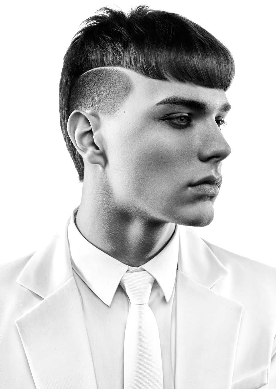 男士铂金发色在短期内不会消失,铂金色可以 立即让客户的发型更具独特性和时尚感。我特 别喜欢将铂金色调与超短、质感发型搭配,以 增加前卫感。将客户的头发染成这种干净的冰 白色调后,务必花些时间与客户讨论在家中如 何保养铂金发色。银色洗发水非常适合保持这 种冰白色调不会出现黄色/黄铜色调,护发产品 包括护发素、发膜、精油和乳霜也有利于客户在 家中使用,以防止头发受损,并在两次预约之间 保持发色和发质的最佳状态。