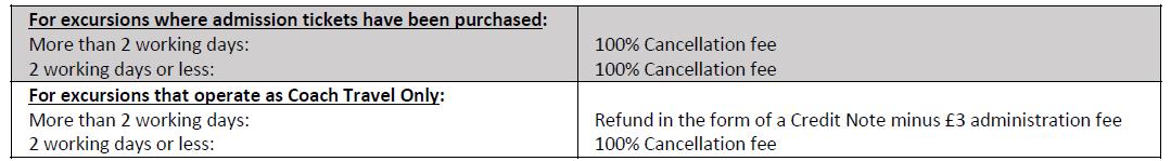 If, after your Excursion Ticket has been issued, you wish to transfer to another of our day excursions we will do our utmost to make the changes, provided that notification is received at our offices from the person in whose name the booking was made. This must be accompanied by a payment of £3 to cover administration costs. If your booking includes a ticket for an event, show or concert, it may not be possible to change this in which case a cancellation charge as detailed below would be payable. Any alteration by you within 2 days of departure will be treated as a cancellation of the original booking and will be subject to the cancellation charges set out below. Other alterations such as the addition of requests or change of pick-up point must be notified and accompanied by a payment of £3 to cover administrative costs. Changes of pick-up point or any additional special requests cannot be guaranteed within 2 days of departure.