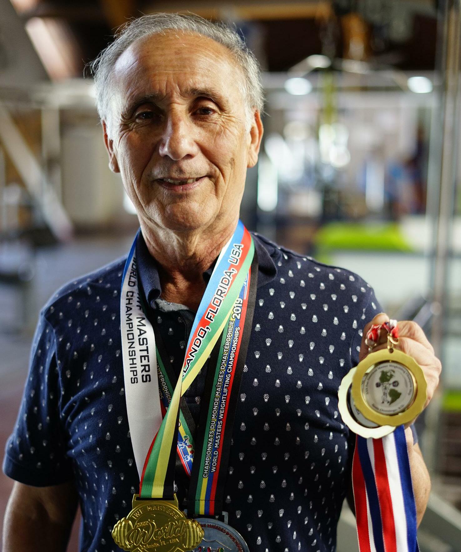 Juan Neftalí Sánchez Soto (75) cerronavino que obtuvo el título de campeón mundial de halterofilia, más conocido como levantamiento de pesas, categoría máster a los 75 años.