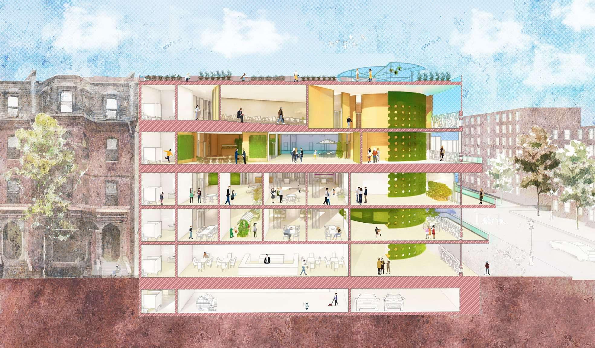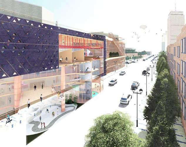 The building encompasses three types of facades: the green walls, the concrete walls, and the curtain walls with symbiotic cladding panels. The symbiotic cladding panel means not only the interaction between plantings and birds but also means the interplay between agriculture programs even the urban environment in Boston.