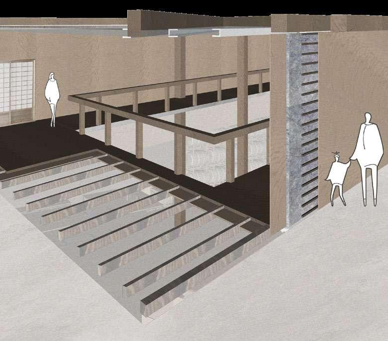 The Indoor rain garden also plays a role in expressing depressed moments. The columns are located intentionally at the corner of the building, and the distance between column and wall remains just wide enough to allow a person to walk through. It gives the feeling of tension to visitors. While they observe the daylight coming from the top of the column, it feels the same as the detainee looking at the light from the ceiling in the quarter room.