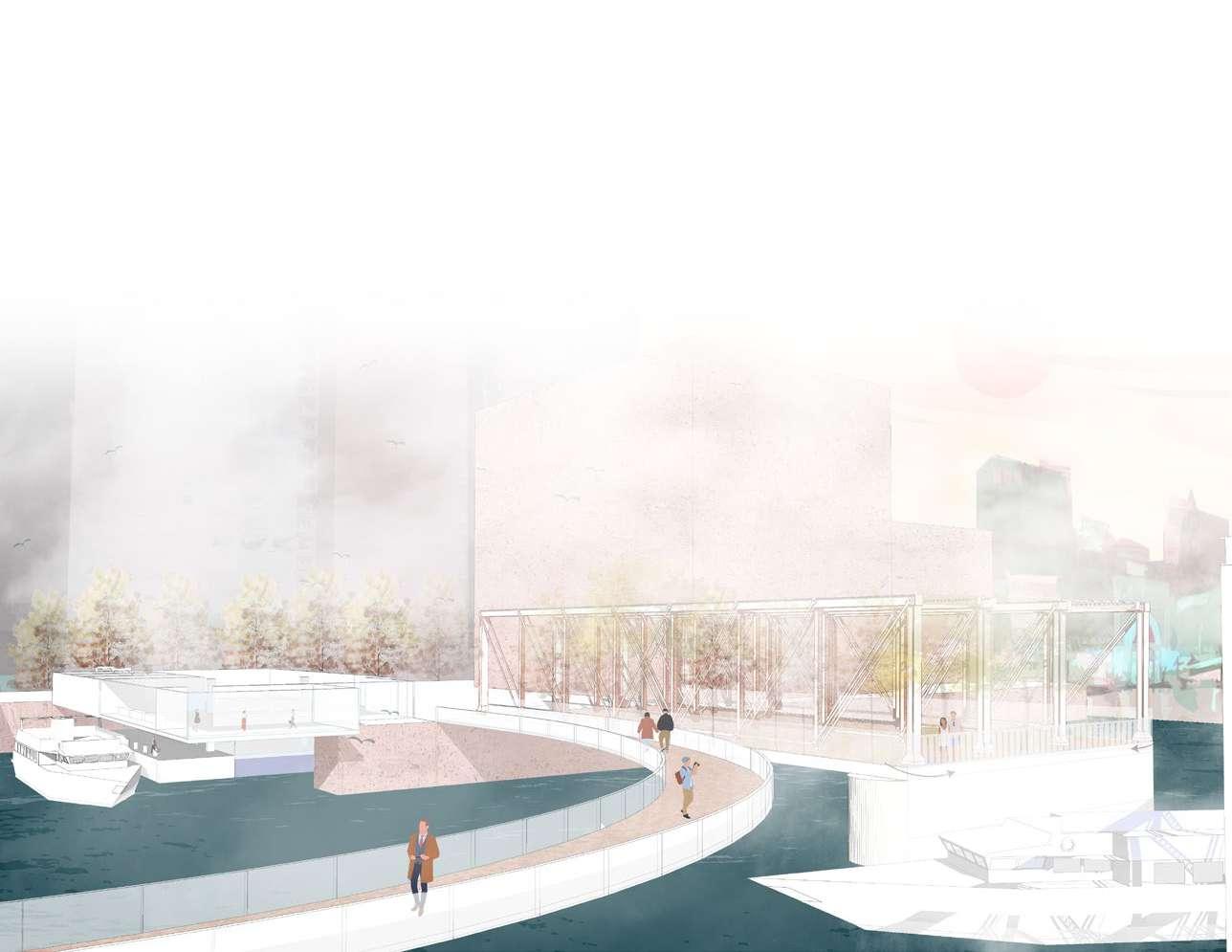 The Mirage on the Water is originally inspired by Boston’s unique climate condition, including an unassuming ferry terminal that looks like a semitransparent box. The terminal connects the harbor walk from both sides and Reactivating the old Northern Avenue Bridge. The Mirage on the water is also expressed as the visibility of transportation. It is learned from the Big Dig, which