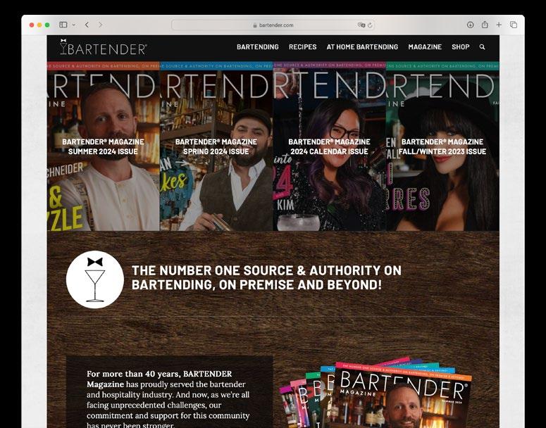 of the magazine. EDITOR’S NOTE: All recipe brands and recipes are published as submitted to BARTENDER® Magazine. The following are registered Trademarks of BARTENDER® Media: BARTENDER® Foundation, BARTENDER “Hall of Fame” ® , BARTENDER® University, B.R.A.T.S, Cocktailright, Cook-Tails. Basic Subscription Price: $30.00 in U.S.A.; US $45.00 Canada; US $60.00 Foreign. Subscription Service: Address all subscription mail and changes of address to BARTENDER® Magazine, P.O. Box 651, Short Hills, NJ 07078. When sending new address, give old address to ensure prompt service. Postmaster: Send all address changes to BARTENDER® Magazine, P.O. Box 651, Short Hills, NJ 07078. Copyright 2024, BARTENDER® Media. All rights reserved. Reproduction in whole or in part in any language without permission of the Publisher is prohibited.