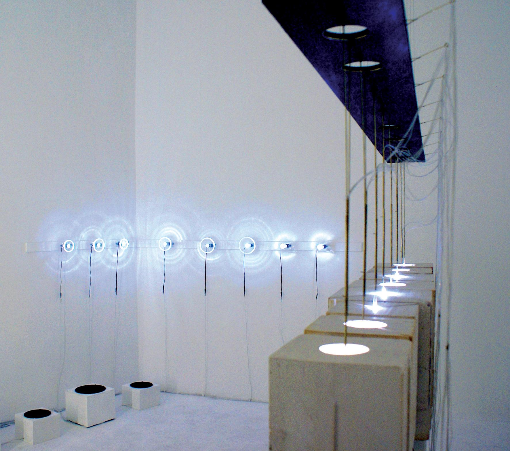 Nick Rich, ‘Light Transformations’: An investigation into our everyday experience of natural magic. Light phenomena transform space to create places of intrigue and contemplation. Flat surfaces appear curved, moving grids produce changing moiré patterns and water lenses create warped images. Light is transformed through very carefully designed louver and prism systems to create magical spaces.