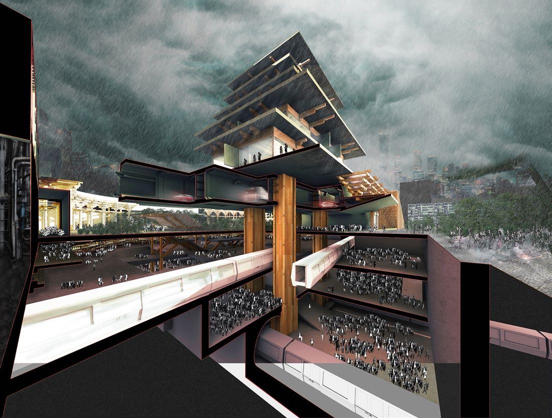 14.5, 14.7, 14.19 Wen Hua (Michael) Huang, Y4 ‘Ascending Gardens’. The project explores a forthcoming scenario for the stations of Singapore by transforming them into garden stations. The project challenges the distinction between the man-made and the natural to revolutionise the identity of Singapore’s current Mass Rapid Transit network. The design focuses on natural cooling techniques to promote cross-ventilation that preserves balance within its botanical core while meeting contemporary transit needs and returning Singapore’s last mangrove reserve to the city.