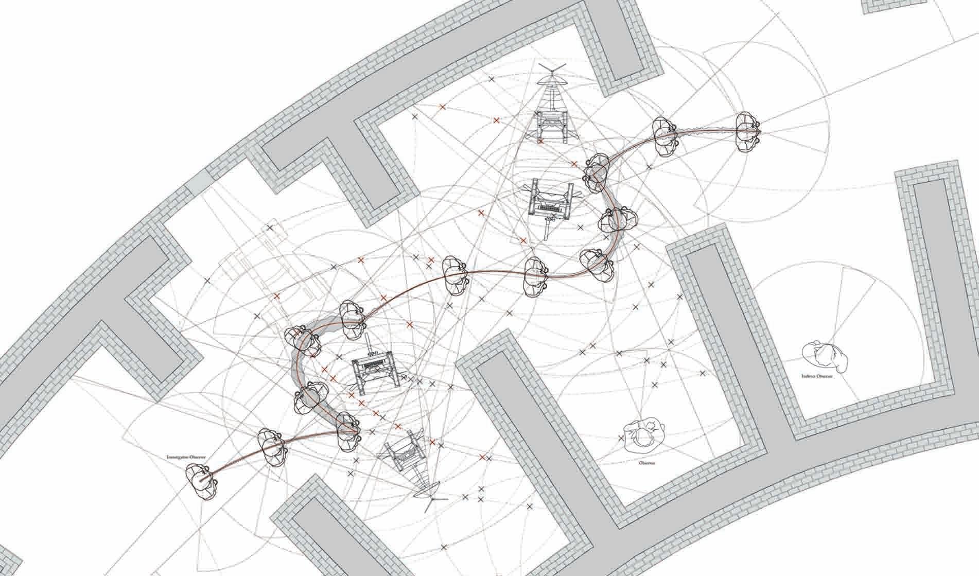 ‘proscenium’ Fig. 14.8 Matt Donkersley In this image, virtual simulation is used to explore and inform the potential application of future adaptive (bio-synthetic) environments seeking performative goals and responding to social issues, principally through the disruption and enhancement of patterns of occupation and conditioning of social interaction Fig. 14.9 David Scott, David’s project presents a contemporary interpretation of the Panopticon as a responsive environment and dataveillance system As visitors interact with the space, a computer vision ‘gaoler’ observes and analyses their occupation of the site The traces they leave are used to animate the ‘prisoners’, kinetic automata, physical manifestations of our ever proliferating digital representations or ‘data-doubles’