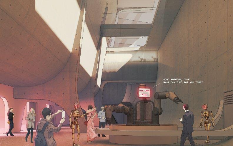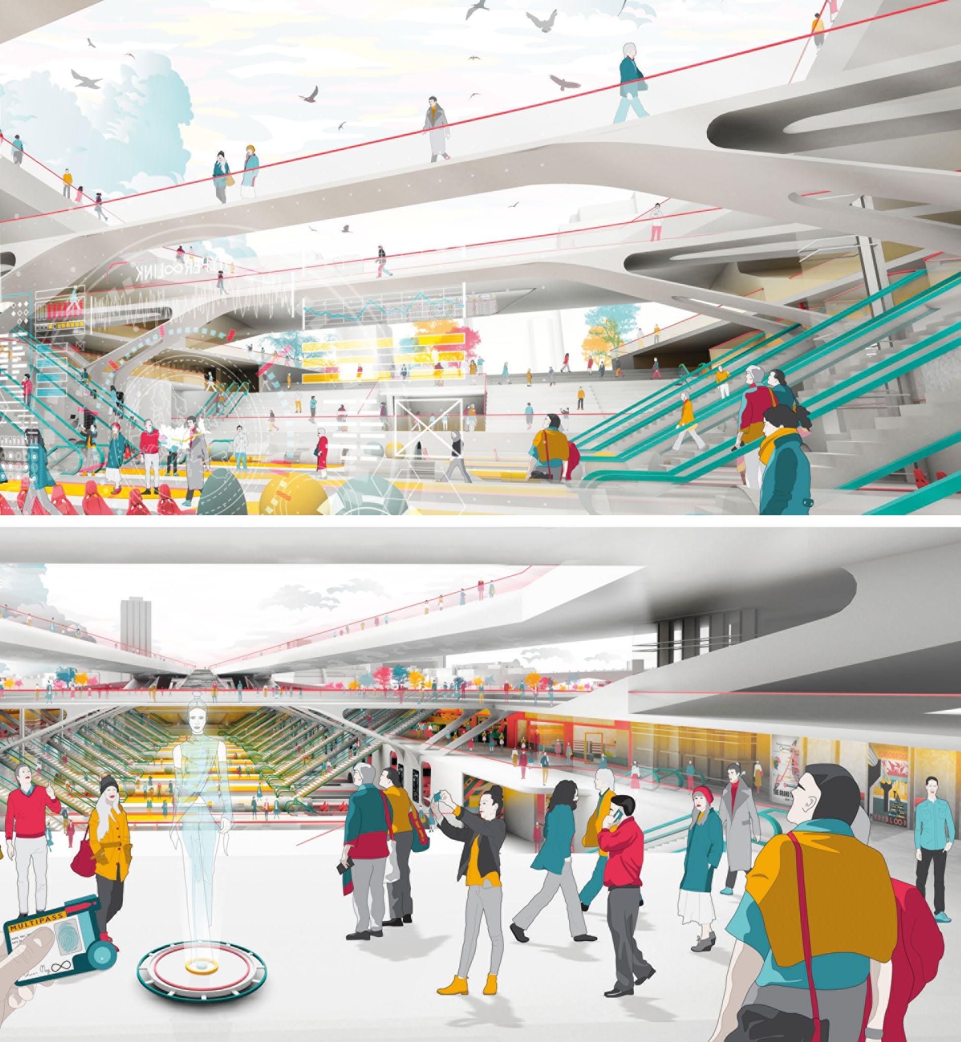 14.19, 14.27 Gyuhyeon Choi, Y4 ‘Hyundai Seoul Transport Hub’. The project reimagines Korean timber framing for a new central transport hub in Seoul. It improves transportation through the diverse, forward-looking transportation systems of the Great Train eXpress (GTX), Urban Air Mobility (UAM) and Purpose Built Vehicles (PBV), while robotic Taekwondo entertains the community and tourists. A supersized set of gong-po provides shelter for the transport systems and re-routes the transit experience, all while celebrating Korean heritage.