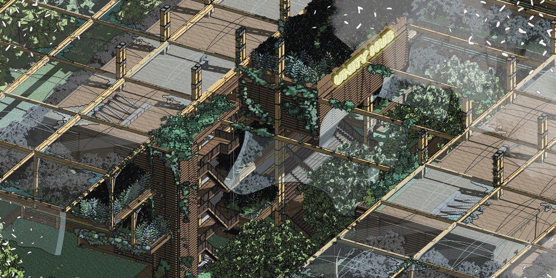 14.13, 14.18 Thomas Parry, Y5 ‘The Automotive Renaissance: British Leyland Rebuilt’. Following the UK’s need to reclaim its lost manufacturing sector, the revival of British Leyland sparks an automotive renaissance. As a historic automotive centre, Birmingham is the natural home for the new British Leyland headquarters. Partnering with HS2 and Formula E, the building becomes a gateway hub into the city, with its timber structure reflecting the contrast between nature and machinery.