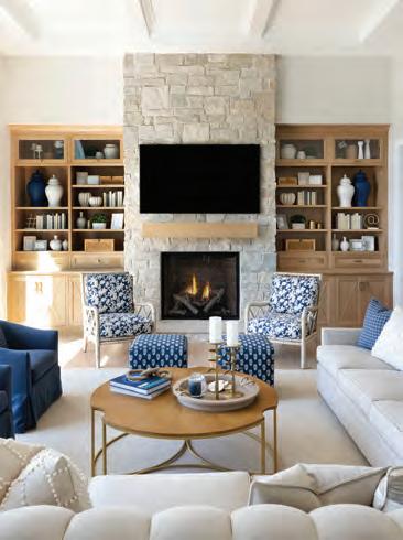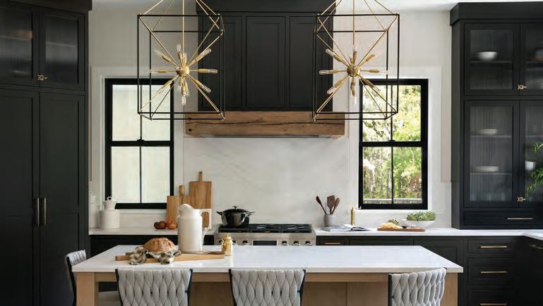 Fun and functionality combine at this five-bedroom, sixbathroom family home in Edina, where the clients were looking for a traditional aesthetic with modern sensibilities. To achieve this vision, double front doors, white-painted Marvin windows, and custom-stained white oak floors pair with gas-burning fireplaces, stylish chandeliers, and an oversized gear closet to store sports apparel and equipment. With two islands and a butler’s pantry, the kitchen offers plenty of space for food prep and hosting, but the basement is party central, featuring a full bar, game room, and golf simulator.