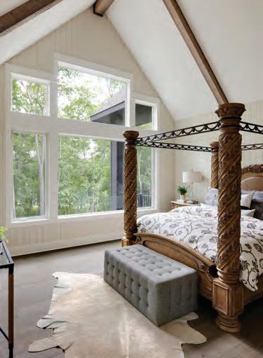 Tucked away on the southern shores of Lake Minnetonka, this modern two-story is a chic take on classic lake home style. A high-contrast color scheme adds visual interest to the exterior, while black floor-toceiling windows allow guests to see through the front of the home to the lake on the other side. Inside, the full-height stone backsplash in the kitchen is a design highlight, as are the custom metal-and-wood interior railing, hand-carved wood fans, and cabinetry details, including a see-through wall divider shelving unit and hidden pingpong storage cabinet. With a balcony overlooking the lake and a wood-burning fireplace, the primary suite is a cozy oasis for the owners.