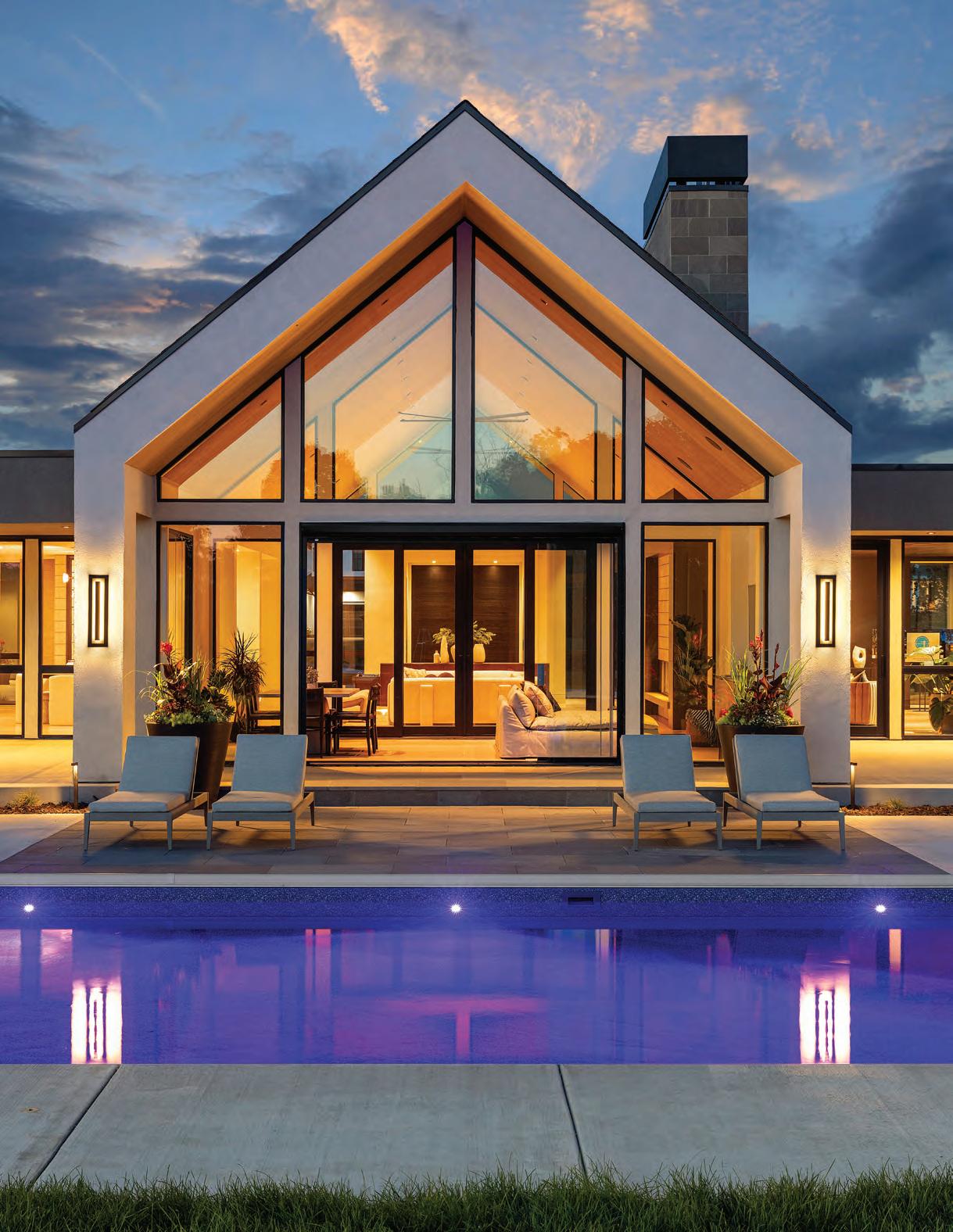 High design meets high performance in this midcentury modern home in Shakopee that prioritizes eco-conscious living. To achieve the desired aesthetic, design elements such as natural stone countertops, elongated sandy brick and wood siding, custom interior wall paneling, and stylish Louis Poulsen lighting were selected. Wanting to highlight the star attraction of the home — sweeping panoramic views of Lake O’Dowd — the homeowners opted for floor-toceiling, energy-e cient triplepane windows. Other must-see features in this collaboration with Unfold Architecture include the floating steel staircase, athletic court, entrance bridge, hidden study, and sauna.