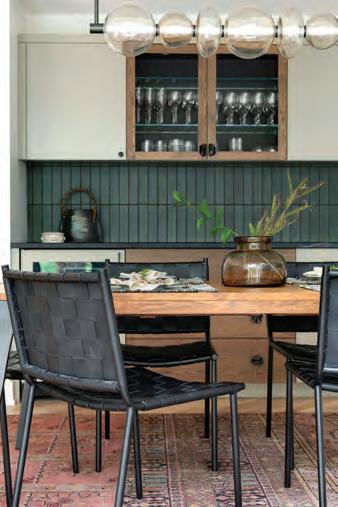 Upon entering through the white oak door, you’re welcomed into a spacious foyer. The open staircase, with exposed steel and wood, serves as a focal point while seamlessly connecting the home’s three levels. Artisan finishes are on display throughout, including white oak hardwood flooring, stone countertops, and custom plaster veneer on the lowerlevel walls and fireplaces. Designed with both quiet moments and entertaining in mind, the home boasts thoughtfully cra ed spaces like a wine display in the dining room, a guitar room hidden behind a secret door, and a dining room that expands into the vaulted screen porch through bi-fold glass doors.