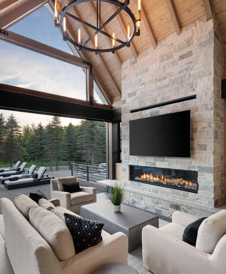 • An added den area was originally intended to serve as a visual balance to the overall space but resulted in a one-of-a-kind room with a vaulted ceiling, skylights, and breathtaking views of the surrounding trees.