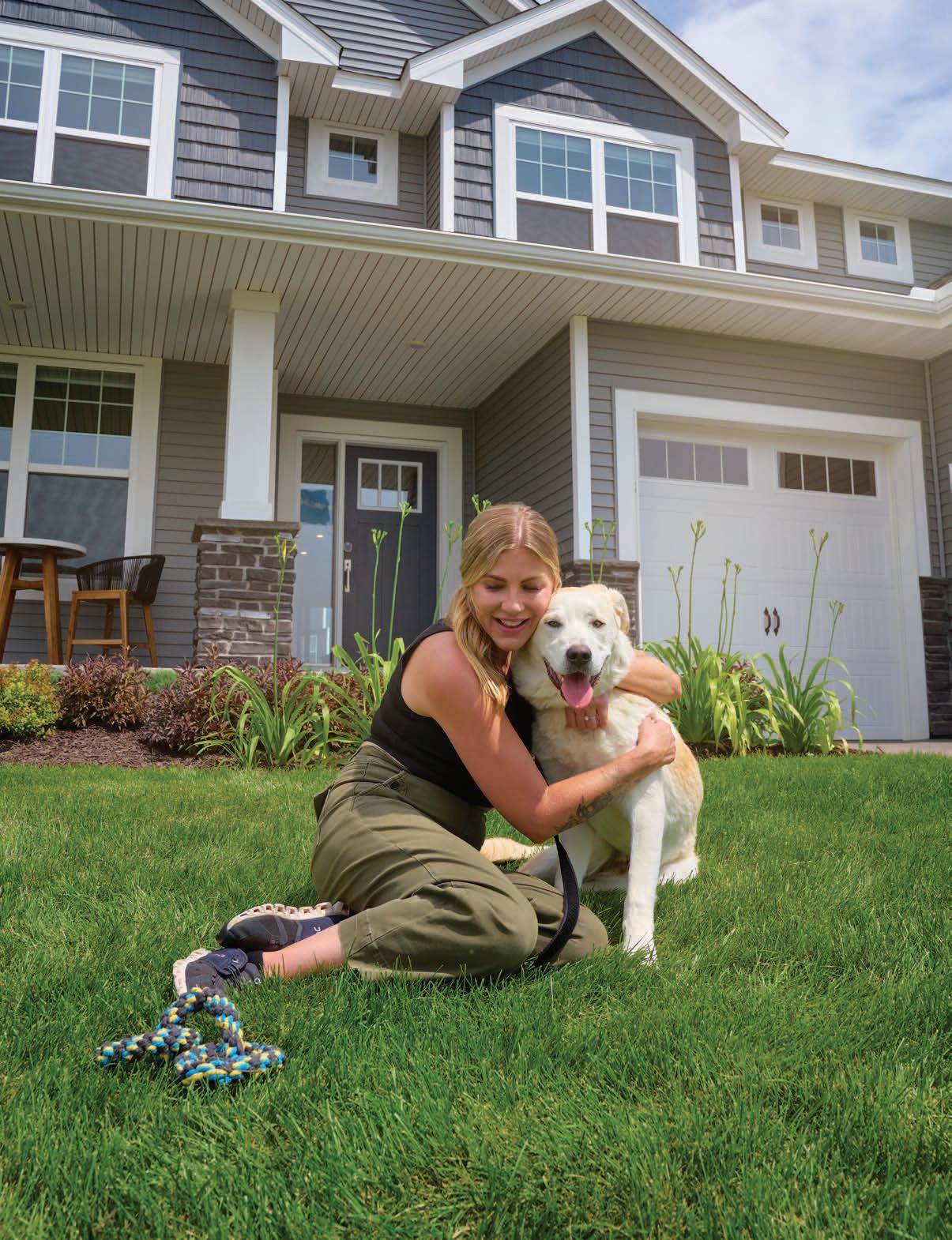Rachel Mairose, executive director of The Bond Between, enjoys time outside with alumnus dog Donny at home #92 by Lennar in Rosemount. Photography by Thomas Strand