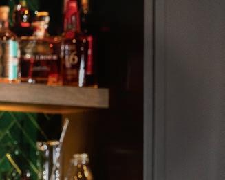 The open footprint is divided into three distinct areas. There’s a comfy lounge area with a large couch and television, the main bar island and spirits wall, and a wine room. Manley decided against doing a closedoff temperature-controlled room for wine because, “then we’d have to sit in the cold. That’s not fun. Instead, we went in for these two wall coolers where we keep whites and sparkling, and since it’s generally a little cooler down here anyway, we keep the reds in the racks.” Manley says that at the end of the night, she and Ambrose often come down for a last glass while listening to music.