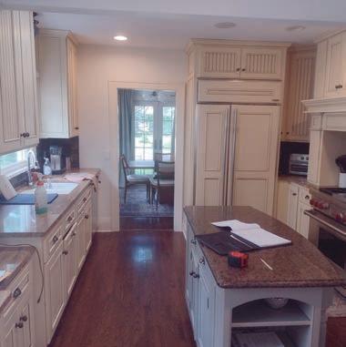 Complete kitchen expansion and remodel, including existing addition renovation. Kitchen cabinets are natural nished rift-cut white oak, slim shaker-style doors. Countertops and backsplash are a beautiful soap stone. Ceiling heights restored to their original height of 9 feet. New metal roof and stucco siding to updated addition.