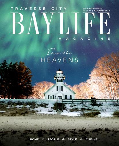 BAYLIFE Magazine Number 72 is an ‘Award Winning’ bi-monthly publication of BAY BREEZE Media, LLC. Advertising Rates available at baylifenorth.com or calling 231-715-6088. BAYLIFE Magazine is a controlled subscription, direct mailed to 8000 affluent homes located on Old Mission Peninsula, Wayne Hill, Slabtown, Traverse City, Incochee and distributed to locations throughout the Grand Traverse Bay and Northern Michigan. BAYLIFE Magazine is owned exclusively by BAY BREEZE Media, LLC. 2024. All content of this publication is protected by copyright and may not be reproduced in whole or in part for any reason without prior approval of the publisher. BAYLIFE Magazine is family owned and is a registered trademark of BAY BREEZE MEDIA, LLC.
