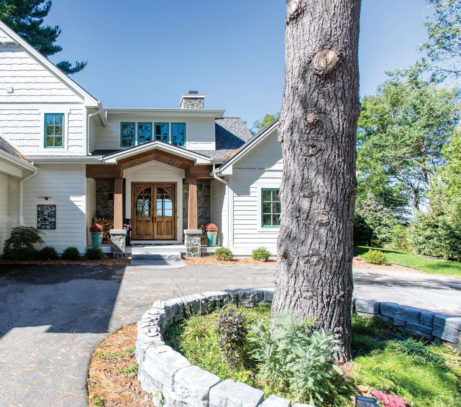 TO KEEP THE LAND AS NATURAL as possible, the Rasmussens were committed to keeping as many trees around the home as they could, so much so that they flipped the footprint of the house around to accommodate for the trees that filled the lot. “We loved one tree in the front,” Connie shares, “and we did everything to keep it, but it died.” Thankfully, they were able to keep the other existing trees around the home. “We wanted the landscaping to incorporate a natural theme all the way down to the water, so we only cleared enough to put in steps,” Gregg says.