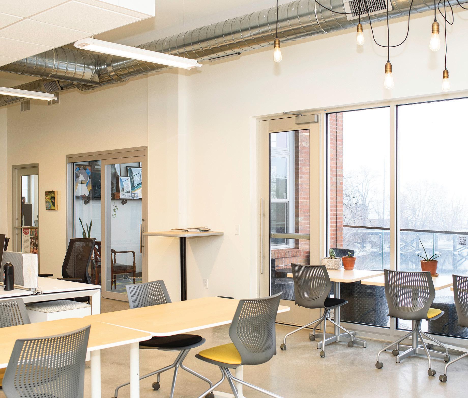 Through the next door, we transition from a utopia of the arts to Common Place Community Coworking. Way more basic, the large open space is full of function and form with multiple desks, computers, and chairs, all barren of personal elements ready to use for anyone who purchases a day pass and other options. Meeting rooms and soundproof nooks are framed around a plethora of glassencased rented offices of numerous businesses, both for-profit and non. Strong Wi-Fi rules, screen time is prime time, and deadlines loom, but the stellar views of the BoardmanOttaway River add a serene backdrop for a busy indoor workday.