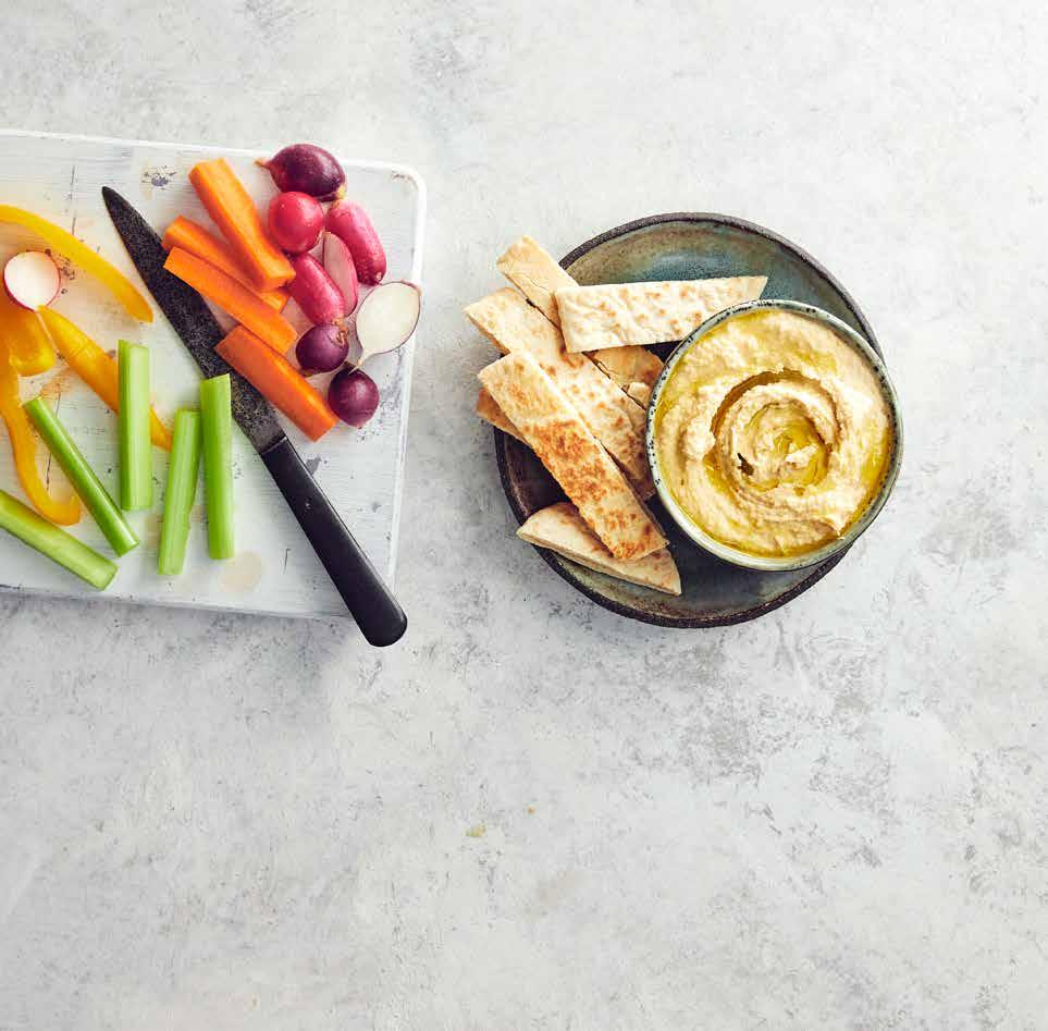3 For the hummus, drain the beans, reserving the liquid from the can. Tip the beans into a food processor with the garlic, paprika, oil and the reserved lemon juice Add 2 tbsp of the reserved bean liquid, and blitz until smooth.