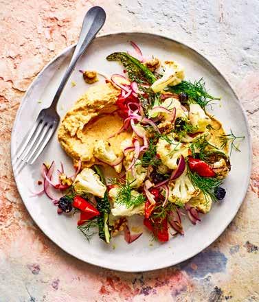 1 Heat the oven to 200C/ 180C fan/gas 6. Rub the cauliflower and pepper all over with 1/2 tbsp of the oil, and roast in a medium roasting tin for 30 mins until tender.