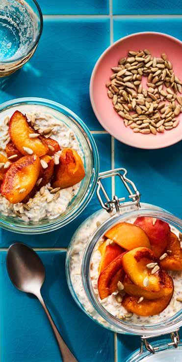 3 The next day, stir the yogurt into the oats and spoon into tumblers, small jars or small bowls. Top with the cooked apricots and sunflower seeds. Will keep covered and chilled for up to four days