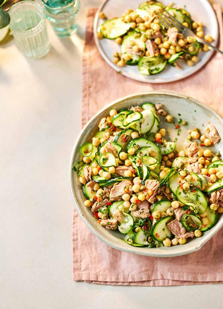 2 x 185g cans tuna in water, drained, with 2 x 400g cans cannellini beans, drained, 1 finely chopped red onion, 2 tbsp capers and the asparagus. Mix 1 tbsp olive oil with 1 tbsp red wine vinegar and 2 tbsp finely chopped tarragon and toss with the salad.