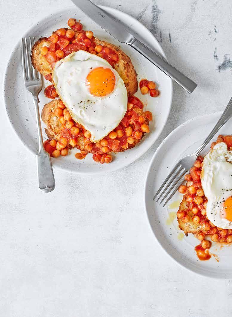 Heat 1/2 tsp oil in a pan and fry 2 eggs. Drizzle the toast with a little oil, then top with the chickpeas and eggs. GOOD