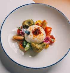 a deeply flavoured, tangy achari sauce, with caramelised onions and green mango providing a delicious contrast. We paired both dishes with the Kinara roti, soft and flaky, enhanced by fenugreek leaves and a touch of clarified butter. For dessert, the Gulkhand kulfi featured candied rose kulfi sat at the centre, surrounded by a delicate ring of chia seeds. To complete the experience, butterfly pea cream was poured tableside over the kulfi, adding a beautiful burst of colour to the dish.