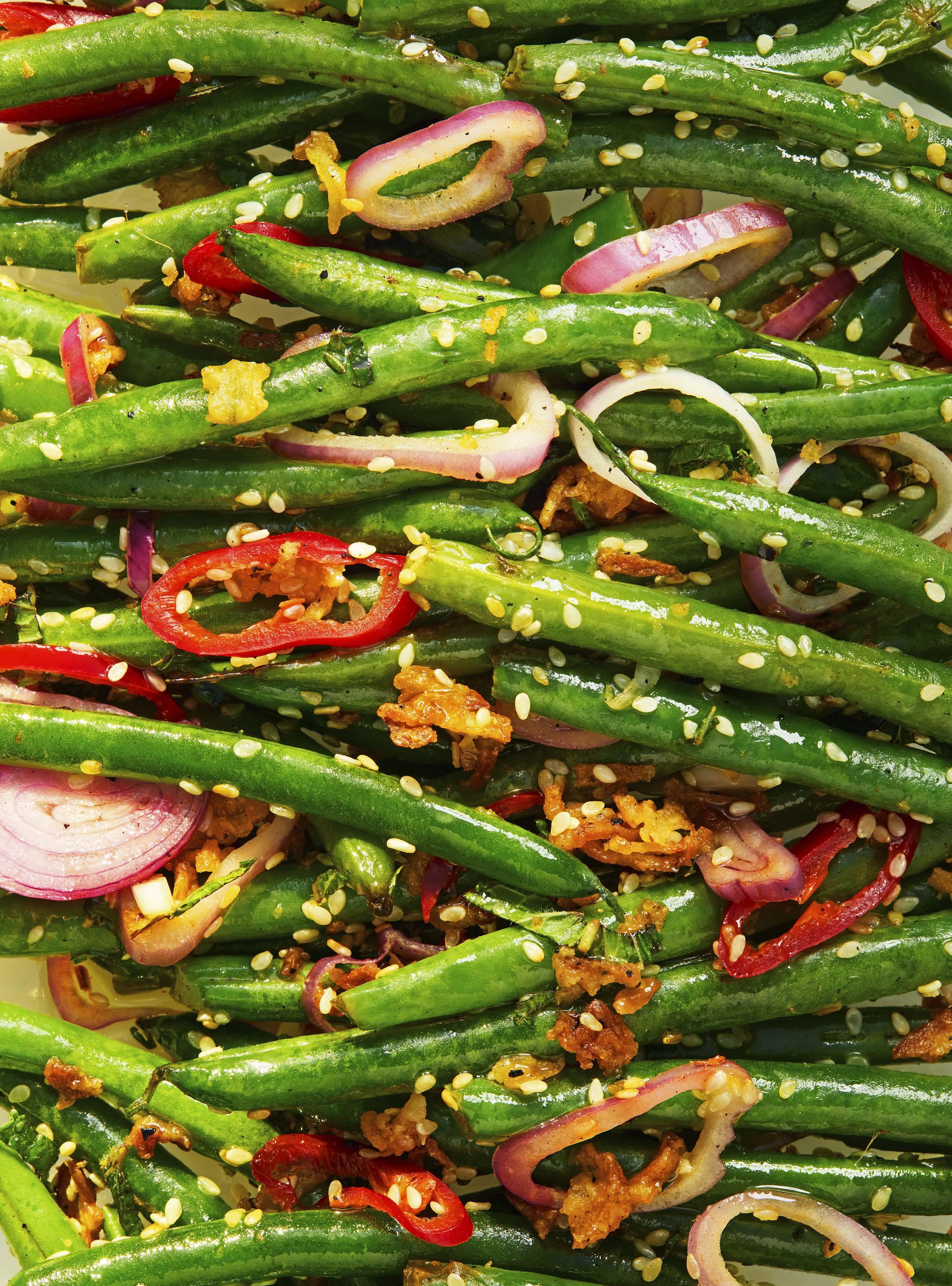 • BBQ gochujang lamb cutlets with toasted green bean & sesame salad