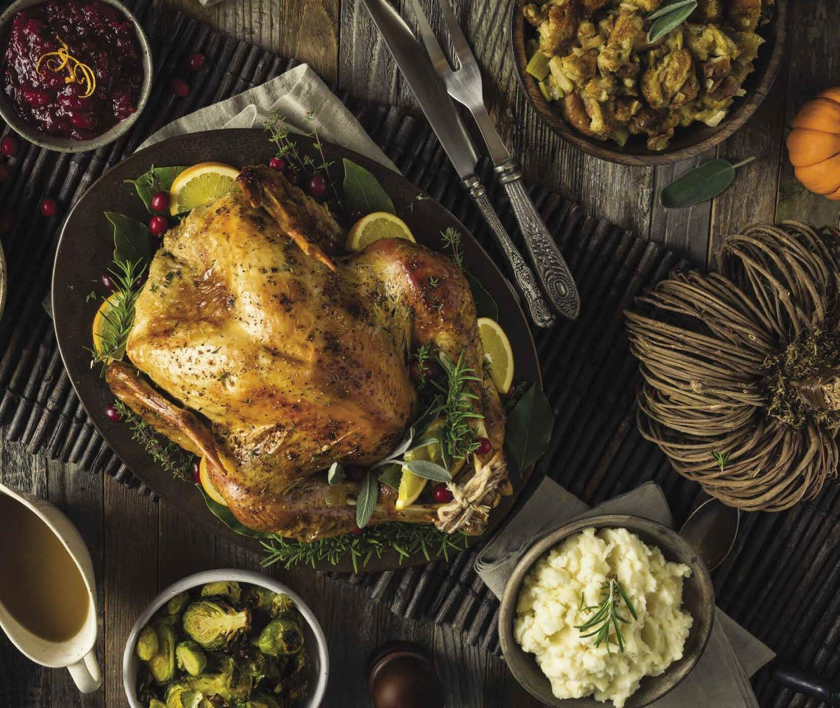 -Caramelized onion and thyme gravy -Citrus cranberry sauce -Red wine peppercorn jus -Horseradish cream -Washington apple and sage stuffing -Roasted garlic mashed potatoes -Green beans with cremini mushroom and shallots -Glazed butternut squash with pumpkin seeds -Dinner rolls with butter (2 dozen)