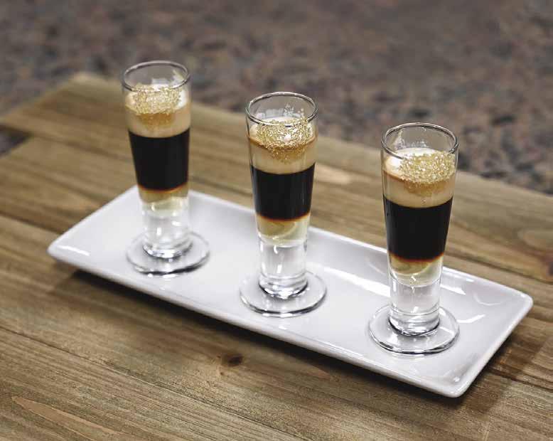 Rim a tall shot glass with raw sugar. Fill with one-third of each liquid, starting with the vanilla.